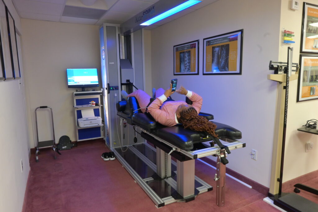 Using this computer technology and the decompression machine, we are able to create a custom treatment plan that decompresses the spine and pulls the herniated or bulging material back into the disc. The computer program is created and supervised by one of our highly trained staff. It gently stretches and relaxes the spine in rotation, which, over time, separates the vertebrae. This creates a vacuum-like effect that pulls the soft bulging disc material back into the disc. This can not only clear up back pain, but also any pain caused by the pressure put on the nerves. For example, patients who have a herniated disc in the lower back may have shooting sciatic pain down their legs. Relieving the herniated disc will cause that pain to vanish.